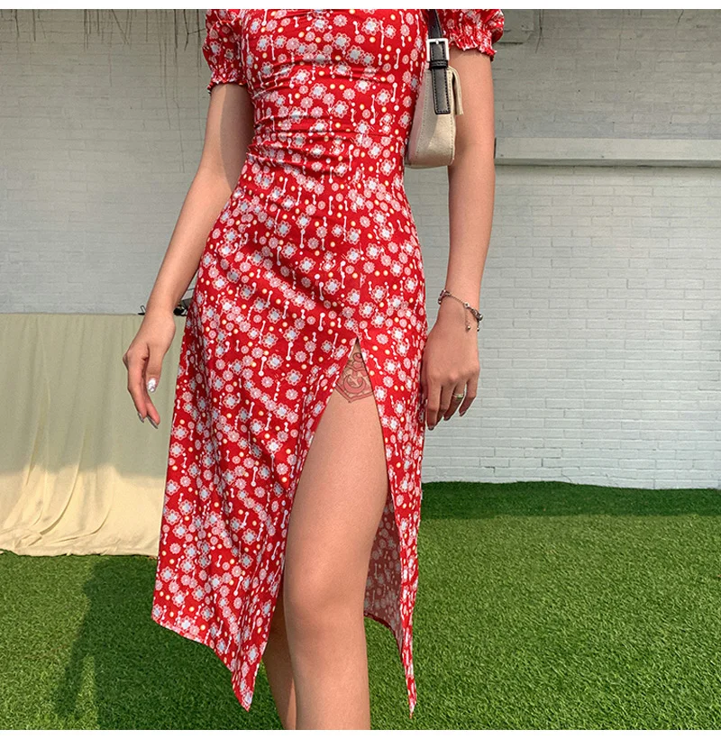 Las mujeres verano Vintage fiesta Vestido estilo francés Puff manga estampado Floral Collar cuadrado lateral Vestido Midi Vestido 2021 nuevo