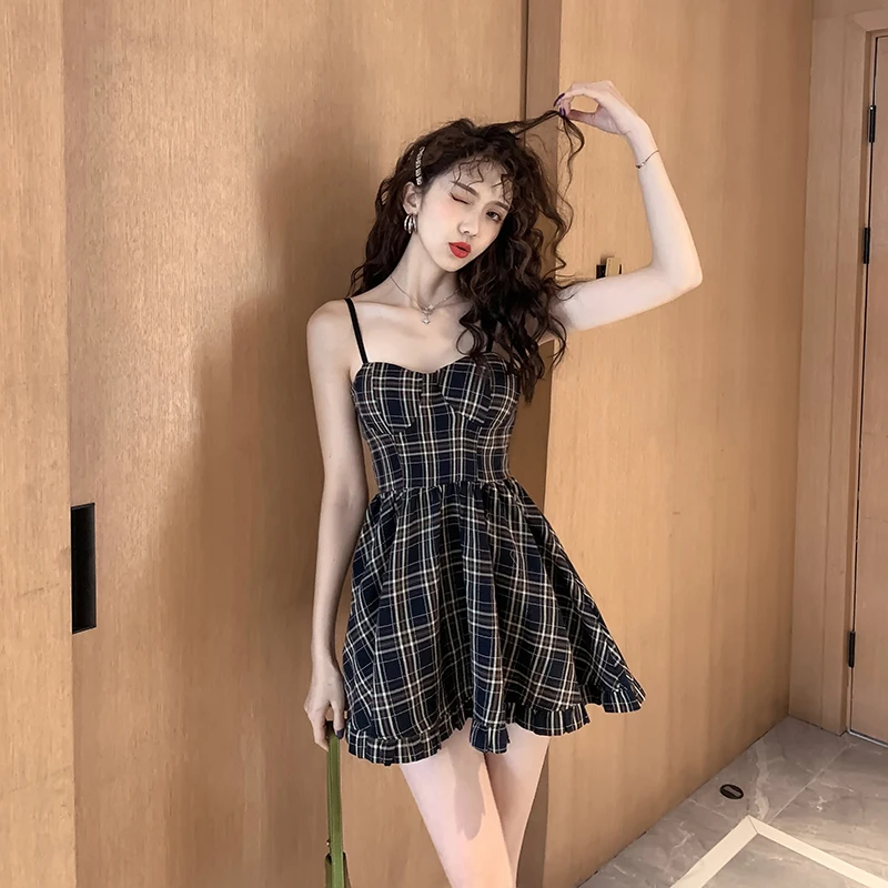 Vestido informal de verano con espalda descubierta y estampado a cuadros para mujer, traje playero con tirantes finos, 2021